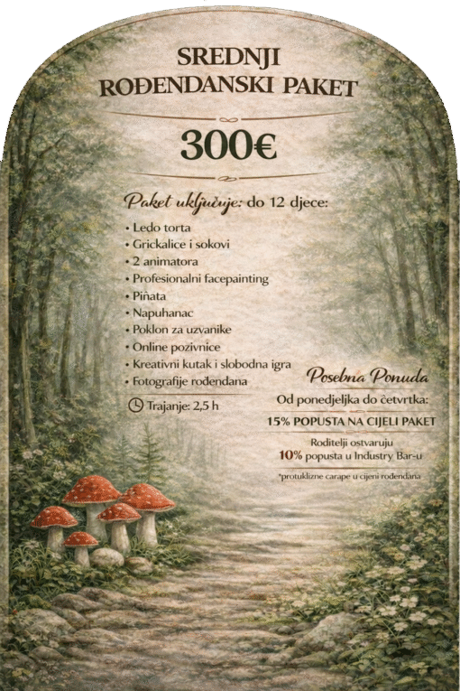 Sladoledna torta uključena u cijenu. Protuklizne čarape uključene za svu djecu. Dva animatora uključena u cijenu. Sve igre prilagođene su dobi slavljenika i gostiju.